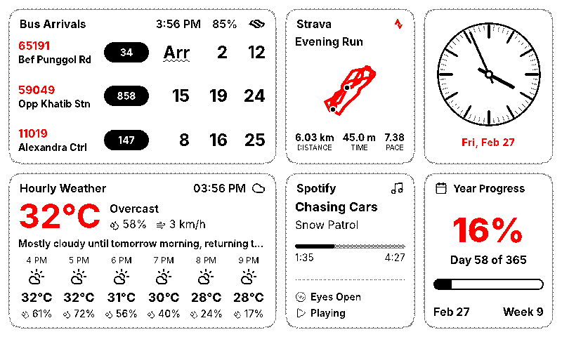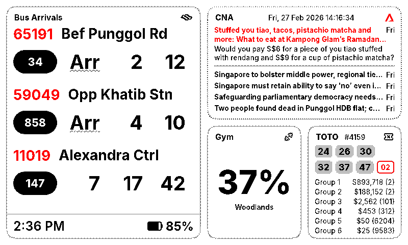 Bus arrivals, gym capacity, news, weather — all on a beautiful e-ink display. Build custom dashboards with drag-and-drop widgets, smart scheduling, and live data.